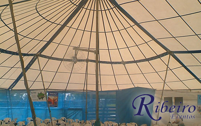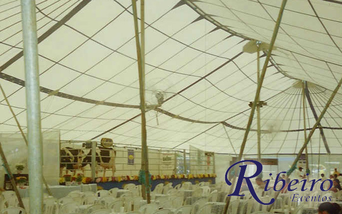 Estrutura para leilão rural: Cobertura tipo circo, palco, cadeiras e mesas.
