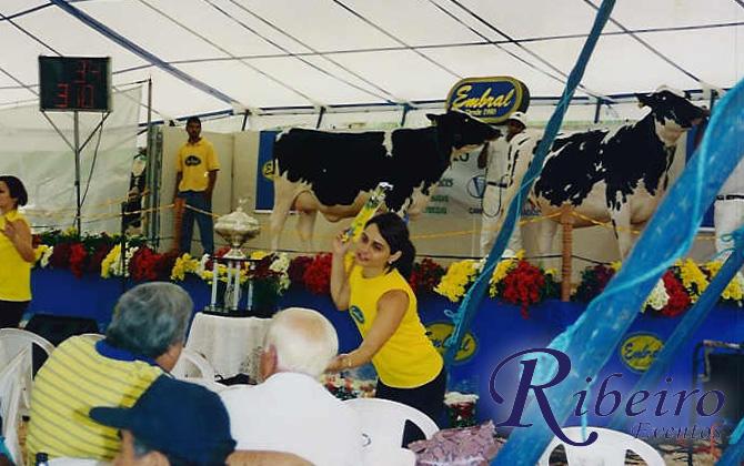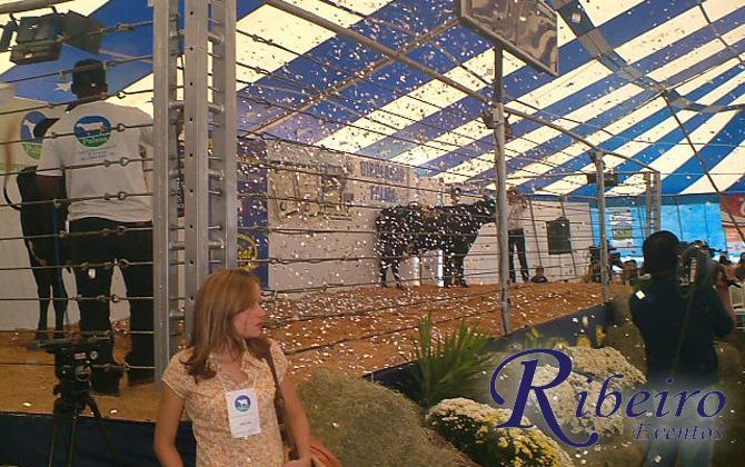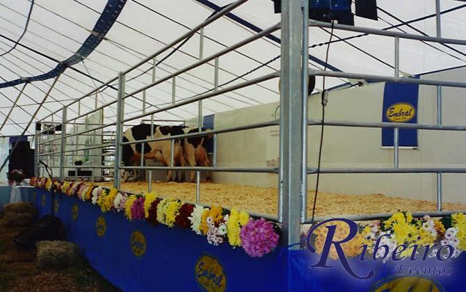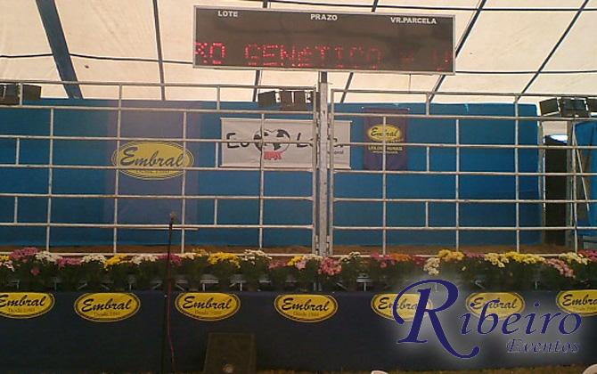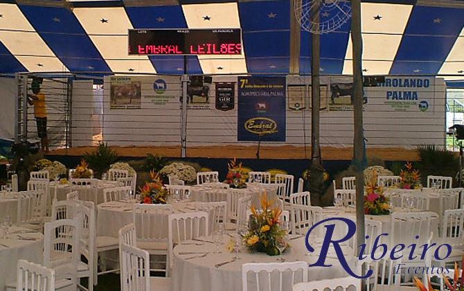 Estrutura para leilão rural: Cobertura tipo circo, palco, cadeiras e mesas.