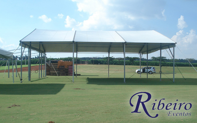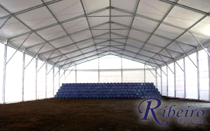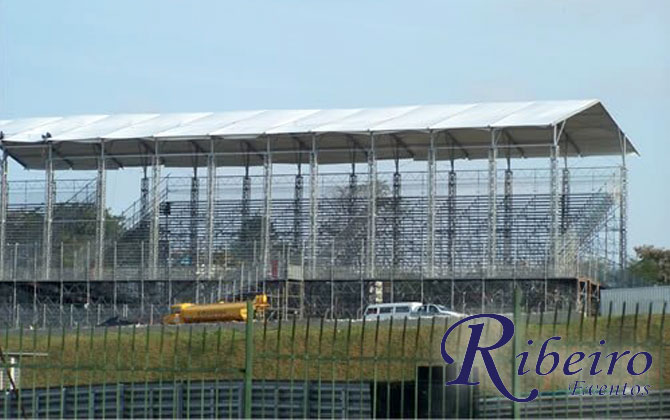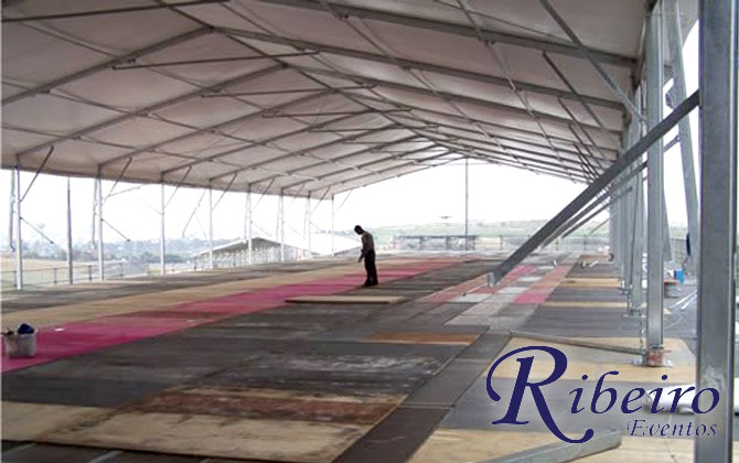 Estrutura para leilão rural: Cobertura tipo circo, palco, cadeiras e mesas.